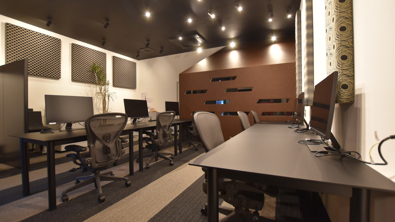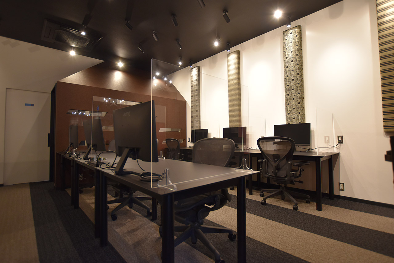 モニターも各スペースに配備してありますので、ノートPCだけお持ち込みいただければ、まるでオフィスのような環境でお仕事が可能です。