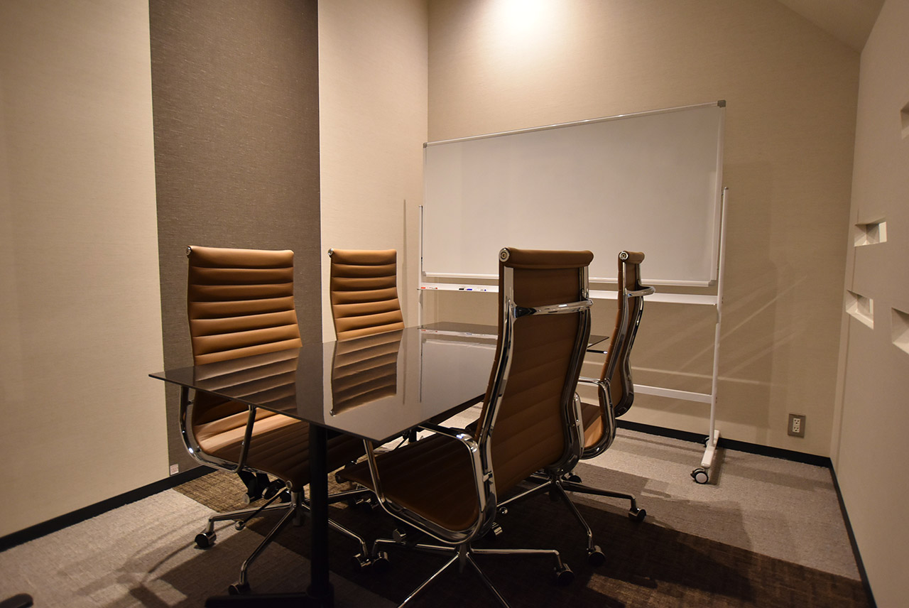 ワークスペースとは区切られた4人掛けのホワイトボード付会議室です。少人数でのミーティングや商談にもご利用いただけます。会議室のご利用は予約制となっております。